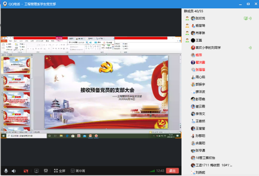 (通讯员 刘曼玉)威尼斯432888cam工程管理系党支部预备党员接收大会会议于6月16日下午4点在线上如期开展。土建院工程管理系党支部书记王静静、工程管理系全体学生党员及11名发展对象参与了本次会议。