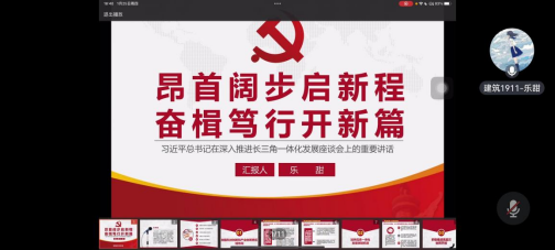 本次党日活动围绕七项内容展开。第一项,全体起立,奏唱国歌《义勇军进行曲》;第二项,全体学生党员重温入党誓词;第三项,由文耀同志带领大家学习并诵读《中国共产党章程》,增强对党的认识,加深政治信仰;第四项,由王吉同志分享学习《关于新形势下党内政治生活的若干准则》的学习心得:“共产党员必须成为实现四个现代化的先锋战士,努力做到又红有专。每个共产党员都必须以无产阶级先锋战士的标准严格要求自己,努力学习和领会马列主义、毛泽东思想,不断提高觉悟程度和进行现代化建设的本领,以求对四化建设做出更大的贡献。”;第五项,乐甜同志为大家讲党课,学习习近平总书记在深入推进长三角一体化发展座谈会上的重要精神;第六项,各支部交流发言,龙林鑫、王雯倩、周传龙依次发言;第七项。各支部小组相互讨论,党员们交流讨论自己的学习心得,表示自己在今后要把习近平新时代中国特色社会主义思想贯彻落实到学习工作中。
